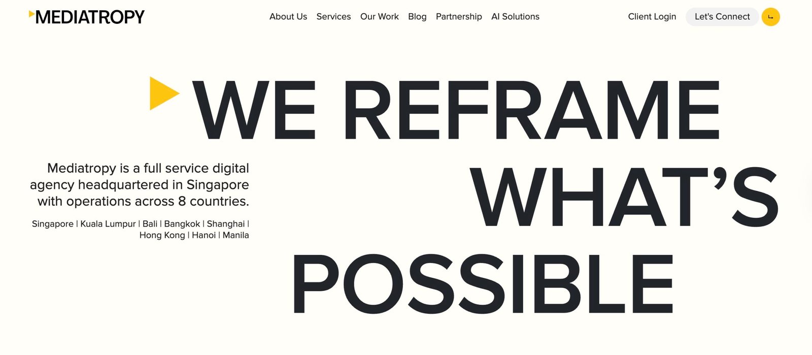 Mediatropy is a full service digital agency headquartered in Singapore with teams across eight countries. Acting as a strategic digital partner, the agency blends strategy, creativity, data, and technology to help brands “reframe what’s possible.” With all capabilities in-house, Mediatropy delivers integrated services spanning performance marketing, SEO, creative and content, UX/UI, web and app development, analytics, and strategy. Their AI-powered tools and human-first approach enable agile, measurable campaigns that drive growth across APAC and beyond.