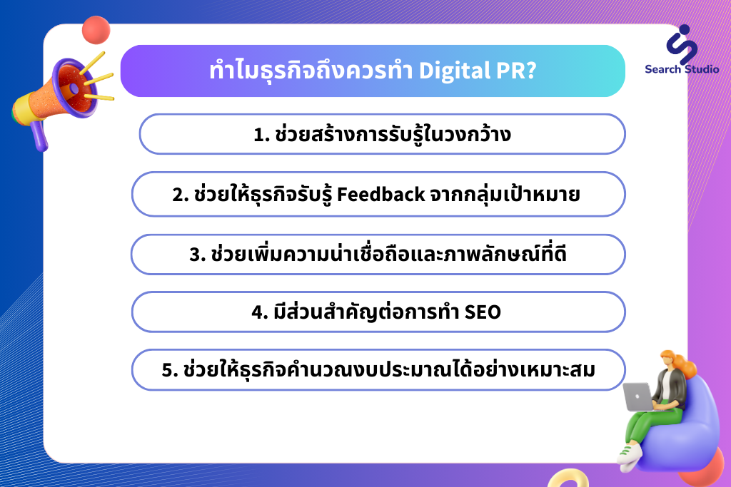 ในยุคที่ผู้คนใช้ชีวิตกับอินเทอร์เน็ตแทบตลอด 24 ชั่วโมง วิธีการประชาสัมพันธ์ด้วยการทำ Digital PR จึงกลายเป็นอีกหนึ่งกลยุทธ์ที่ธุรกิจไม่ควรมองข้าม เพราะสามารถช่วยสร้างการรับรู้และเสริมภาพลักษณ์ให้ธุรกิจได้ในหลายมิติ ดังนี้